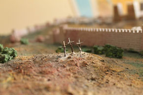 Jesus korsfästes utanför staden, se [Heb 13:12]. Troligtvis låg Golgata på en höjd vid någon av huvudvägarna, väl synligt för alla som passerade in och ut ur staden.