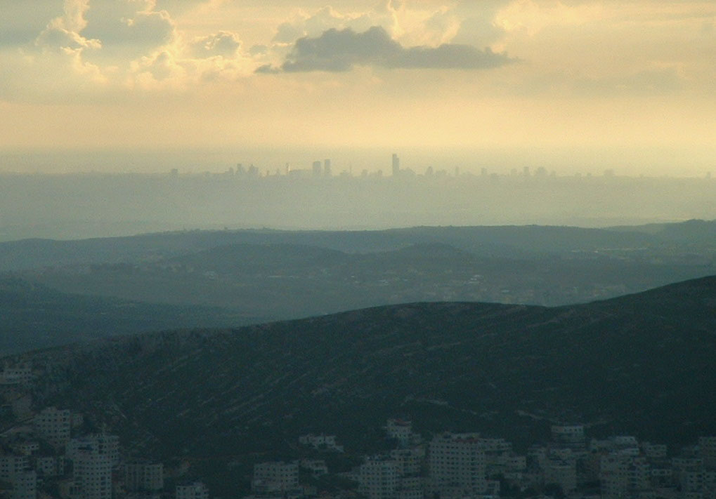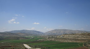 Till vänster syns berget Gerizim och till höger Ebal. Längst till höger (norrut) finns Josuas altare. I sänkan mellan bergen ligger staden Shechem, som på hebreiska betyder skuldra, ett passande namn eftersom bergen ser ut som två skuldror.