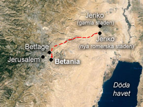 Betania ligger tre kilometer öster om Jerusalem. Här bodde Marta, Maria och Lasarus som Jesus ofta besökte när han var i Jerusalem.